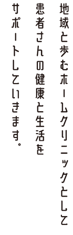 当クリニックでは、在宅医療として、通院困難な患者さん宅へ出向き、診療を行う『在宅診療』と、がんなどの病気の治療が困難になってしまった患者さんが、残された日々をご自宅で過ごすために苦痛を取り除く治療(緩和医療)を行う『在宅緩和ケア』を行っています。在宅での診療、緩和医療をご希望される方がいらっしゃいましたら、お気軽にご相談ください。